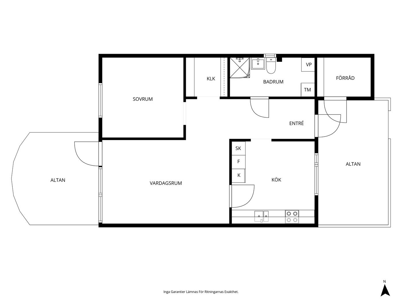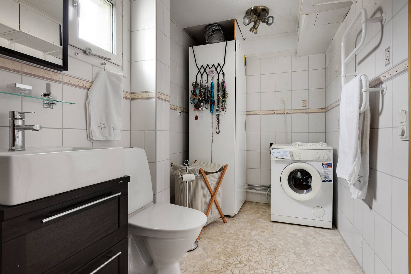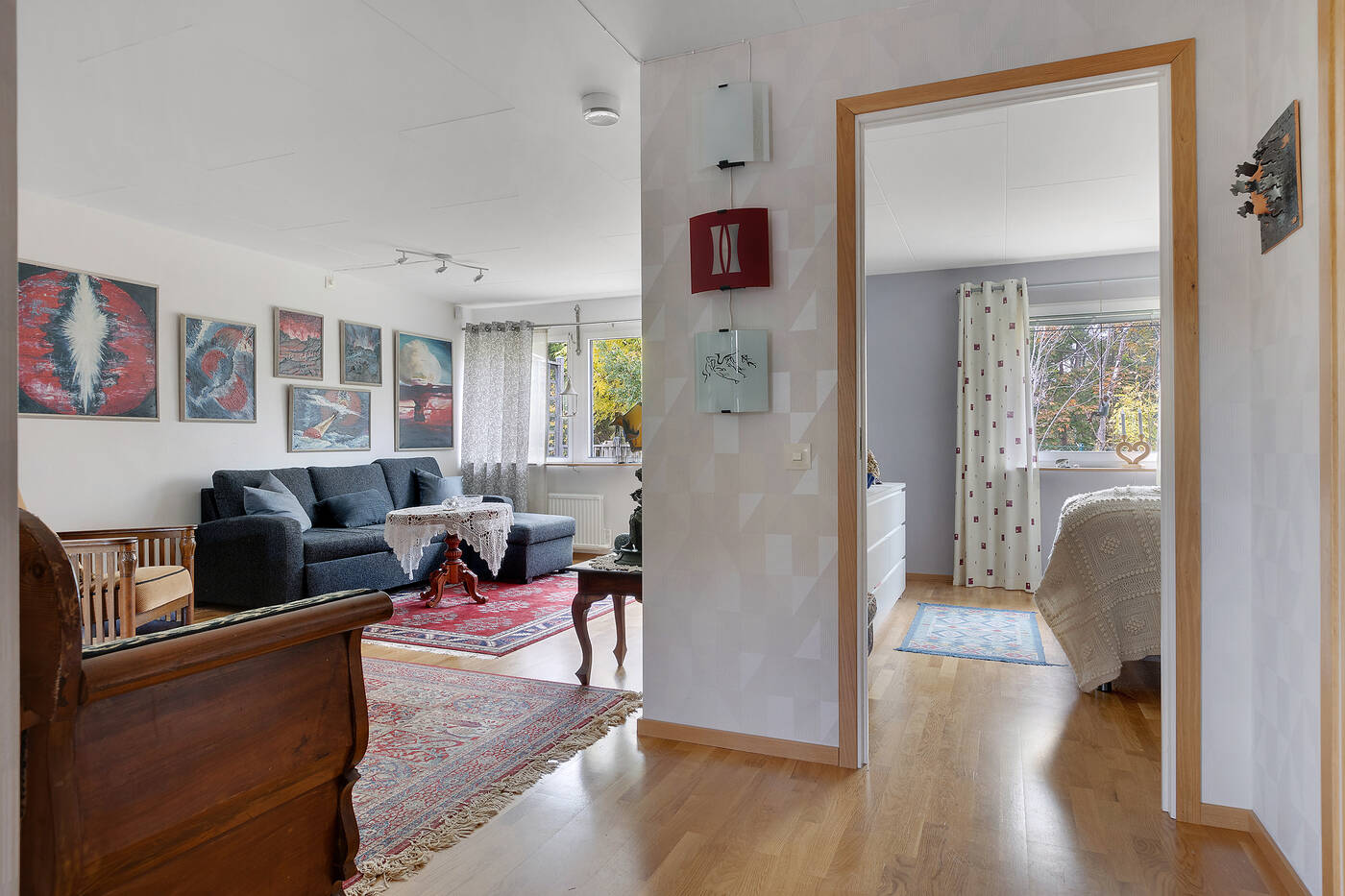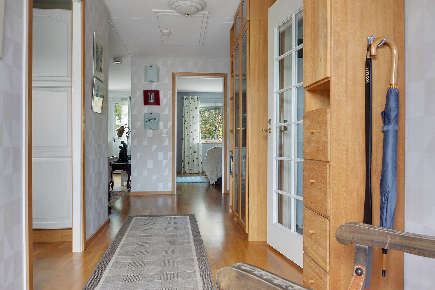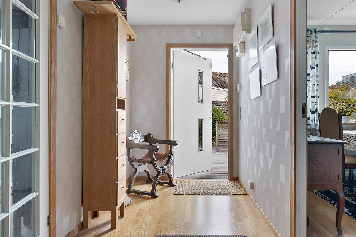 Välkommen in i entréhallen varifrån du har köket med matplats på vänster hand och det helkaklade badrummet på höger hand. Rakt fram till vänster ligger vardagsrummet med utgång till altan och till höger finns det stora sovrummet. Klädkammare.