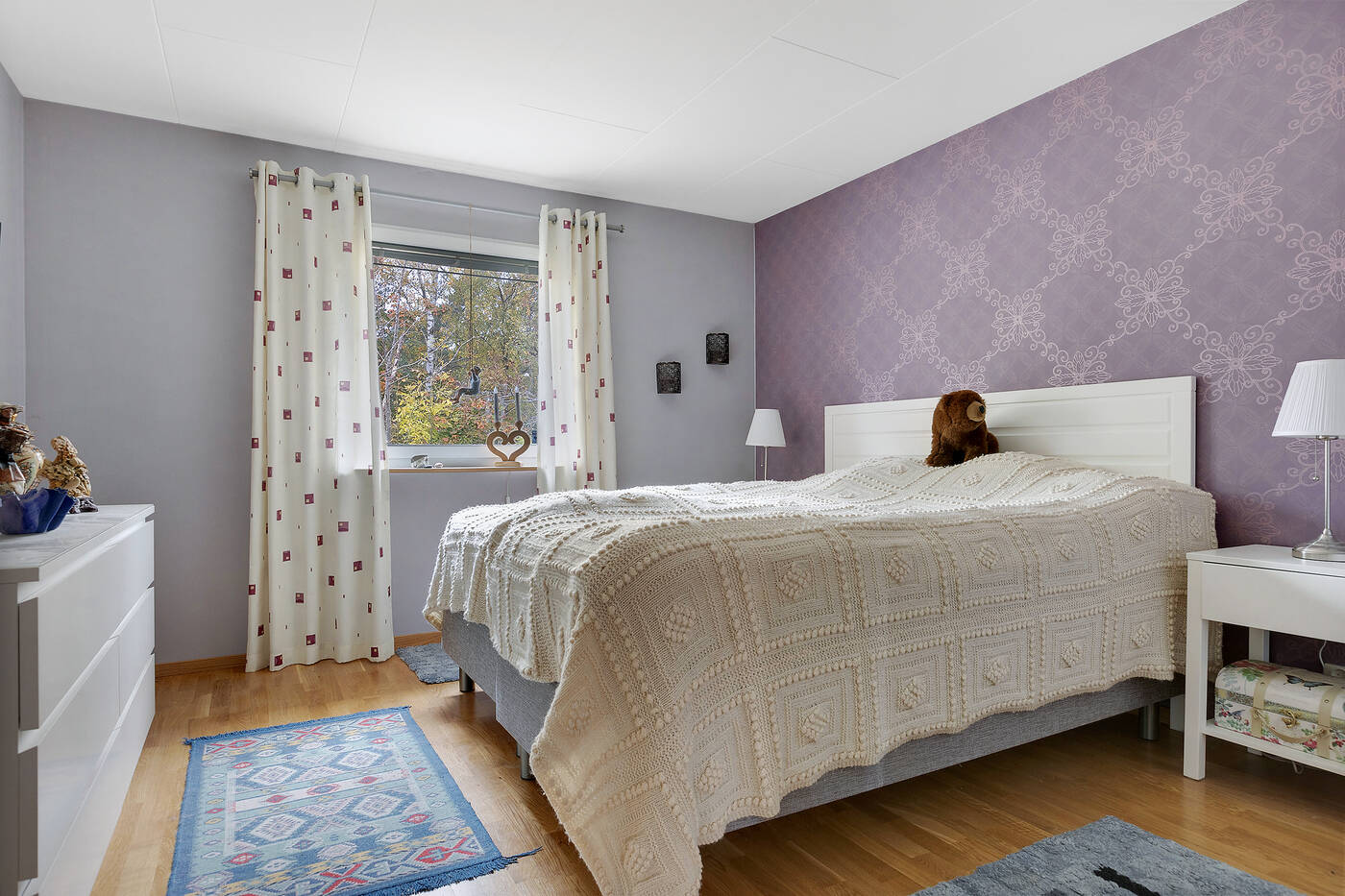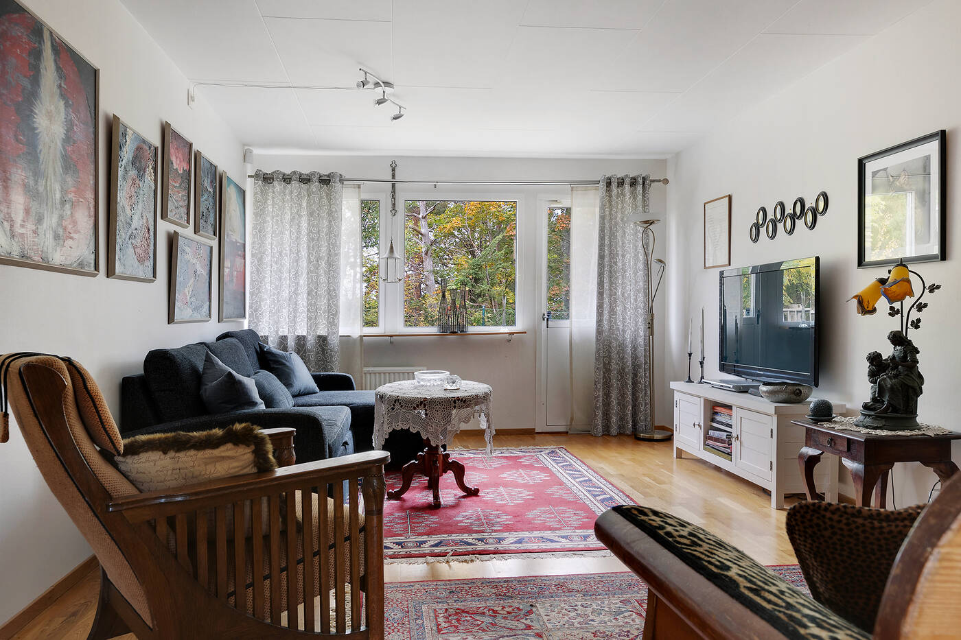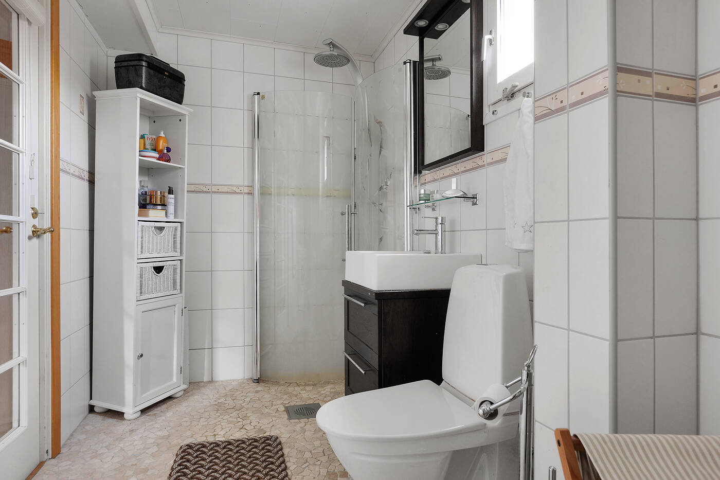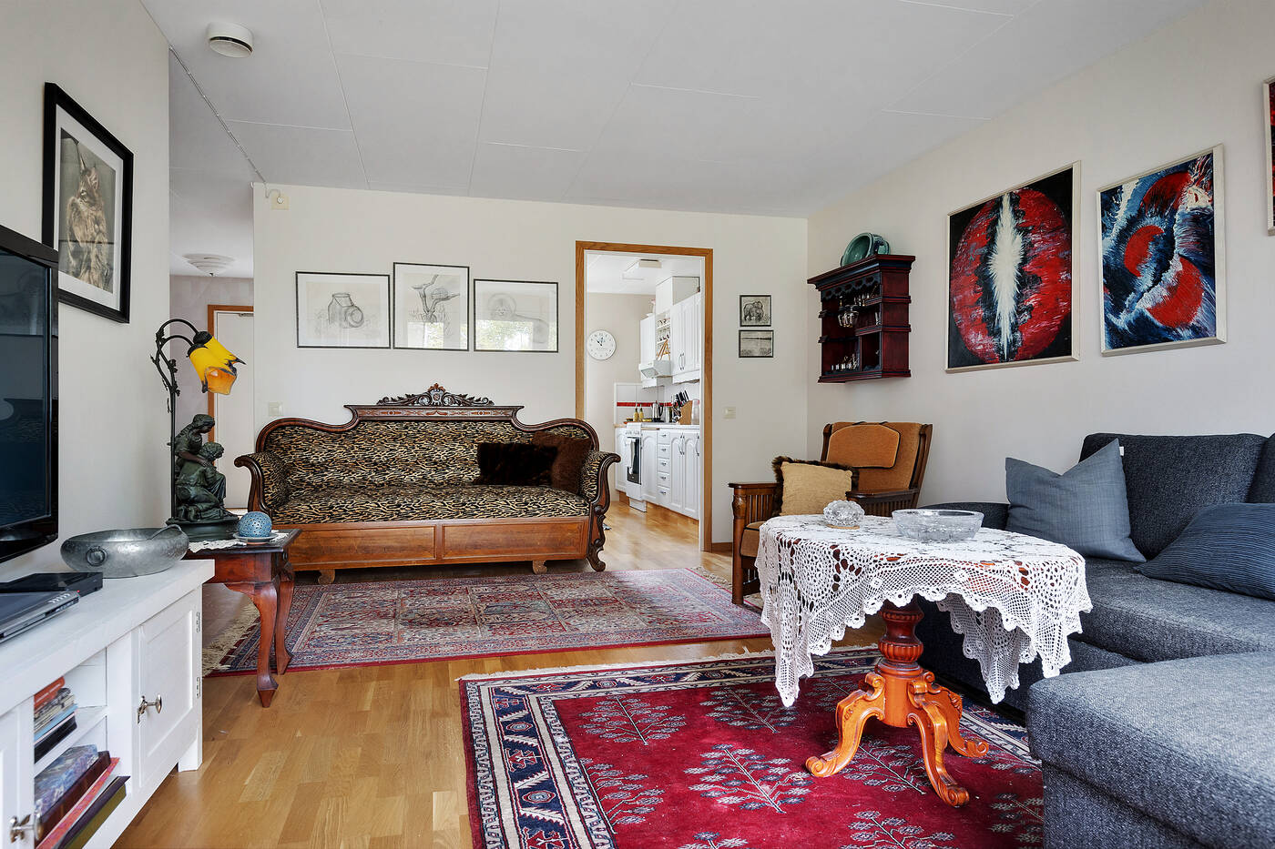 Välkommen in i entréhallen varifrån du har köket med matplats på vänster hand och det helkaklade badrummet på höger hand. Rakt fram till vänster ligger vardagsrummet med utgång till altan och till höger finns det stora sovrummet. Klädkammare.