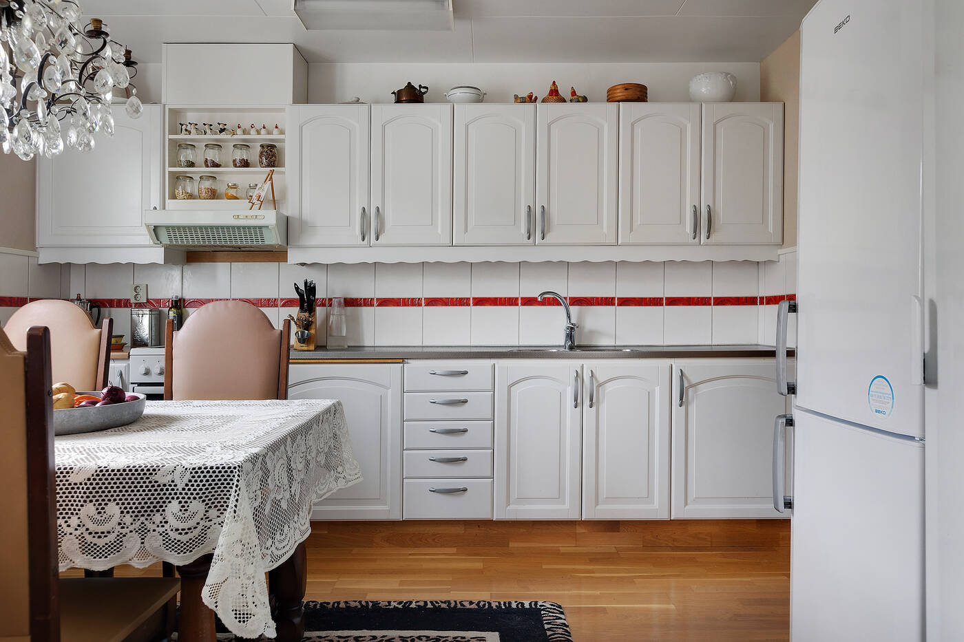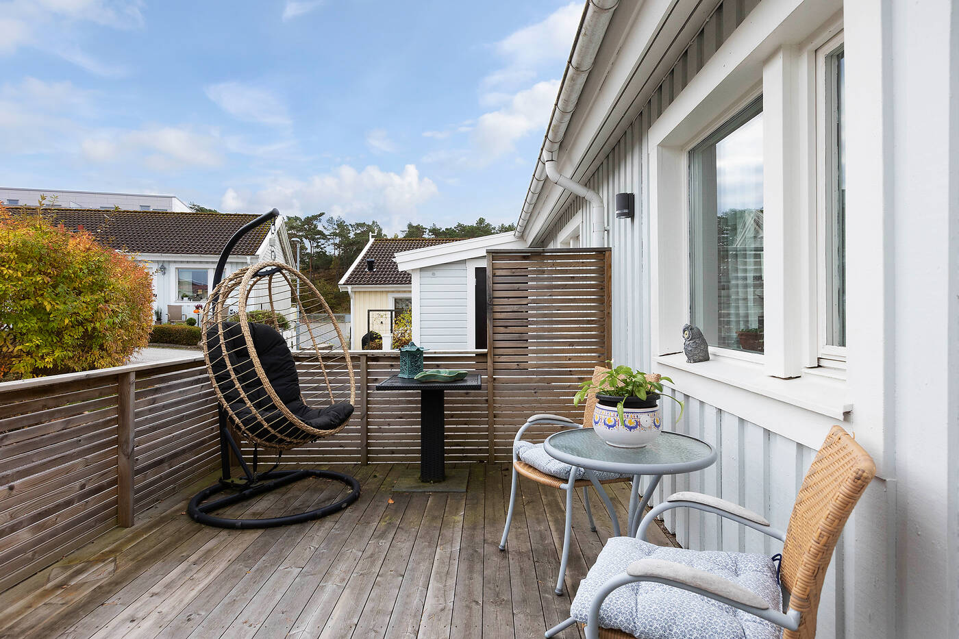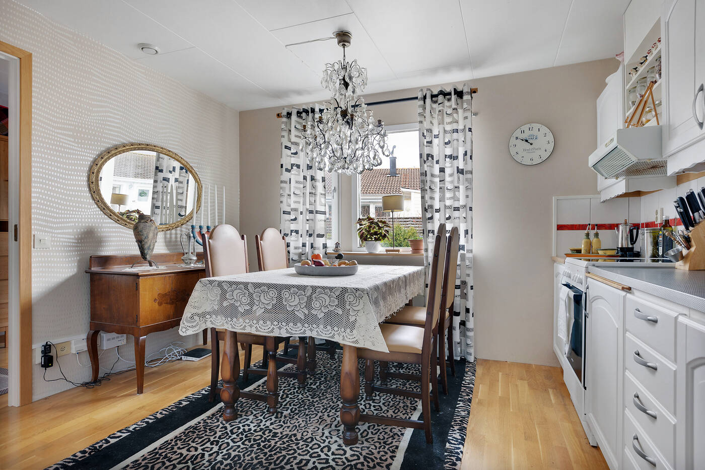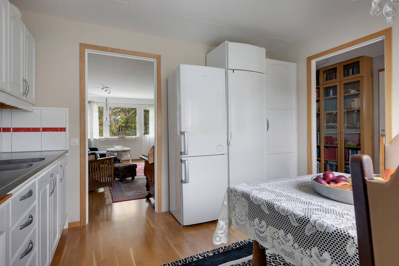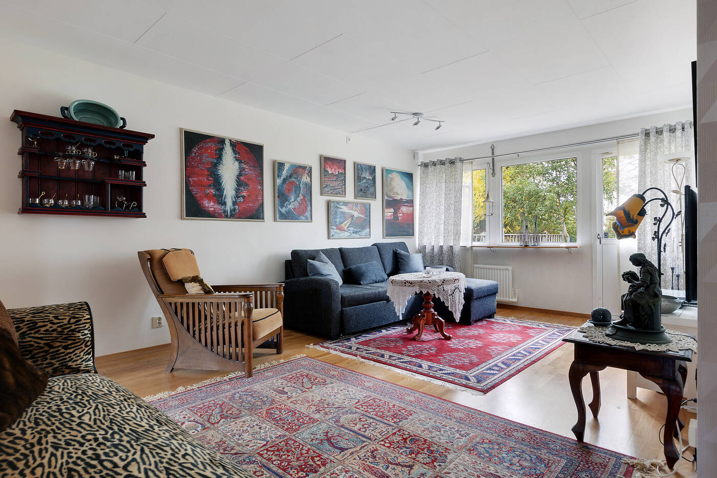 Välkommen in i entréhallen varifrån du har köket med matplats på vänster hand och det helkaklade badrummet på höger hand. Rakt fram till vänster ligger vardagsrummet med utgång till altan och till höger finns det stora sovrummet. Klädkammare.