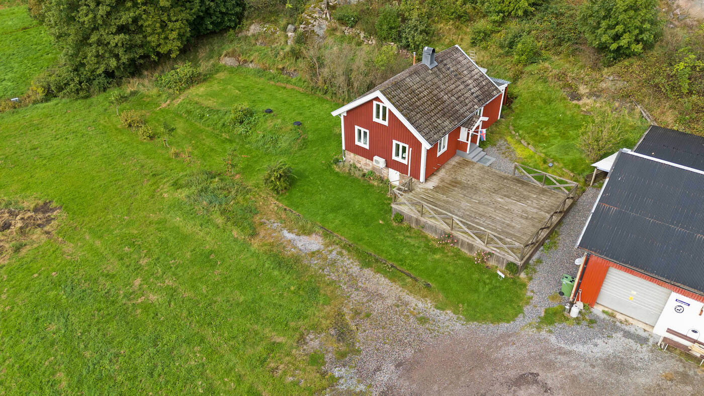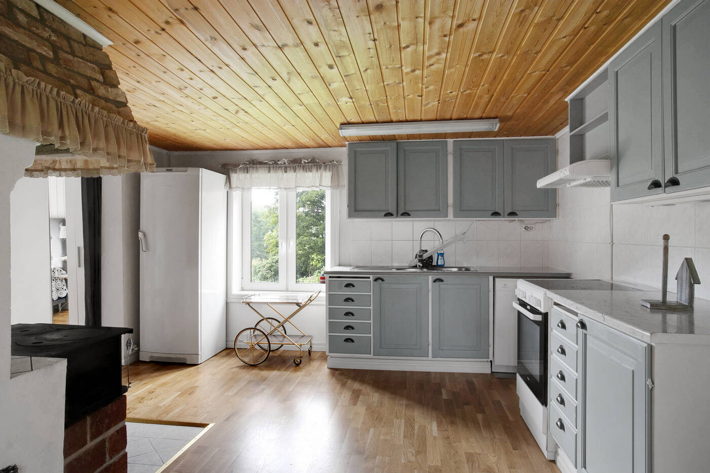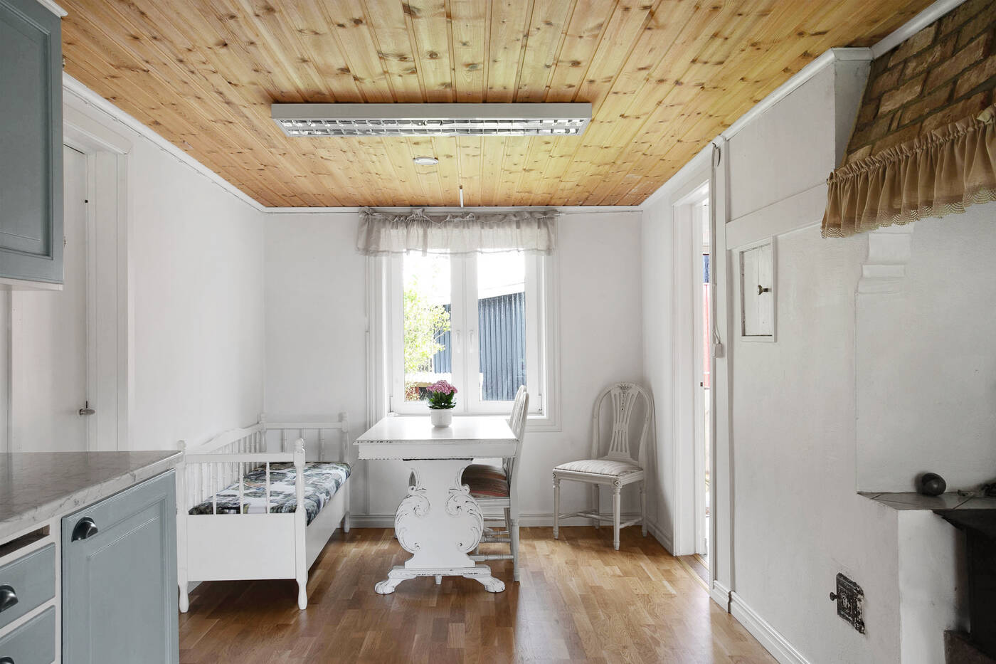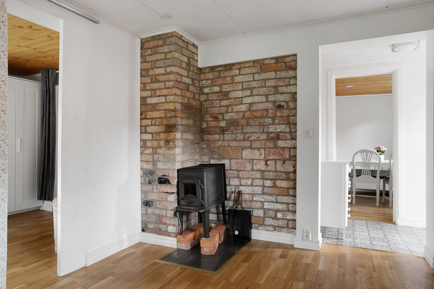 Välkommen in i entréhallen via en stor solig altan. Från hallen kommer du in i en storstuga med vedspis och ekparkettgolv. Innanför storstugan finns första sovrummet också med parkettgolv. Från hallen når du köket med vedspis förutom normala vitvaror, också med parkettgolv. Till höger finns en helkaklad tvättstuga med tvättpelare och ett helkaklat badrum med WC, tvättsäll och duschhörna. Boyta c:a 60 kvm. En brant trappa leder till en loftliknande övervåning med hall, förråd och sovrum. Boyta c:a 40 kvm. Vidbyggd ved-/ redskapsbod. Härlig tomt om 1001 kvm Boyta 60 kvm med fruktträd och gräsmatta för barn med spring i benen.