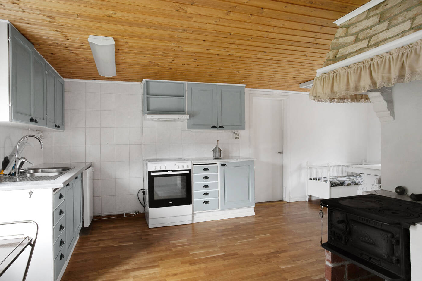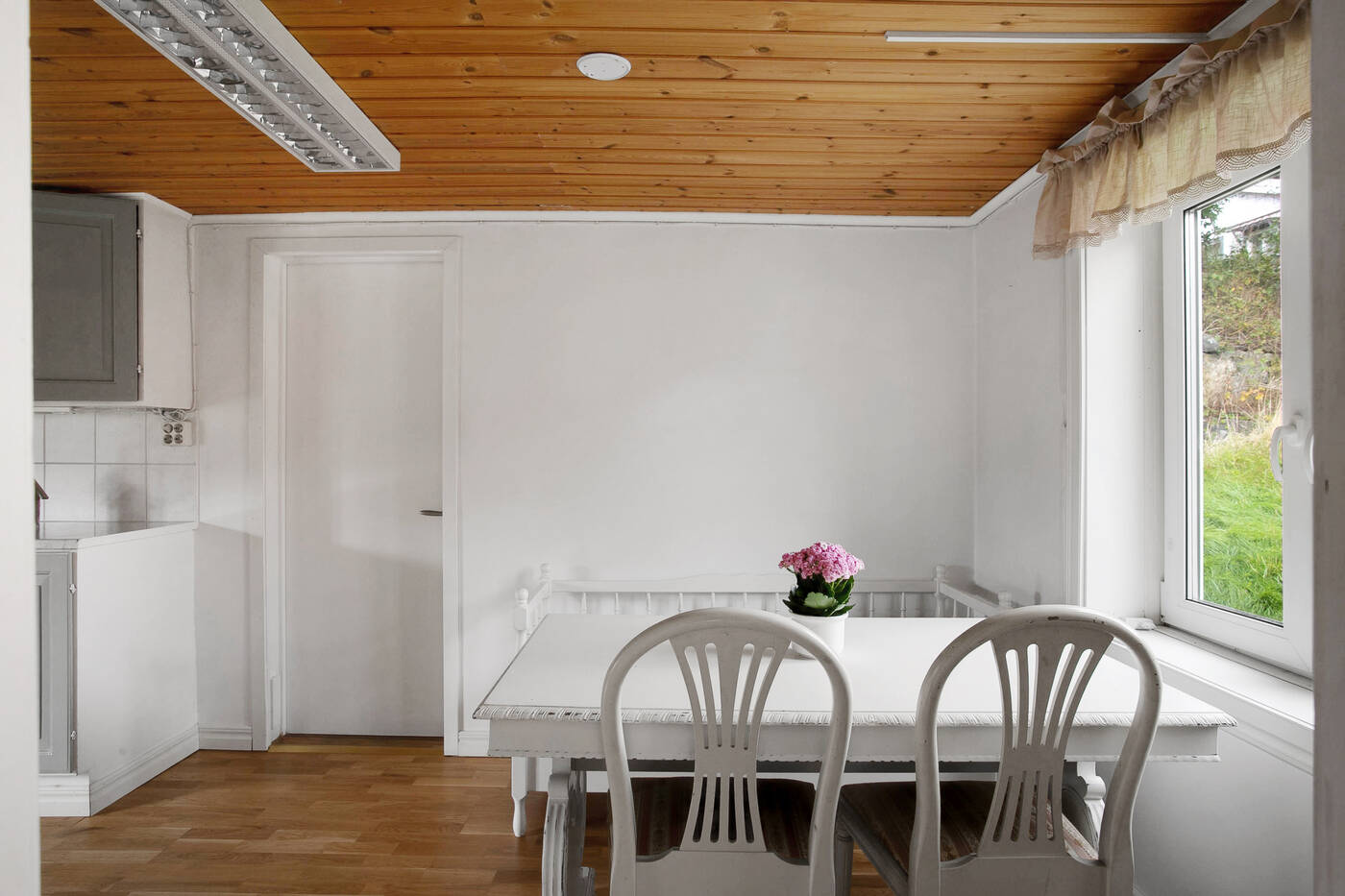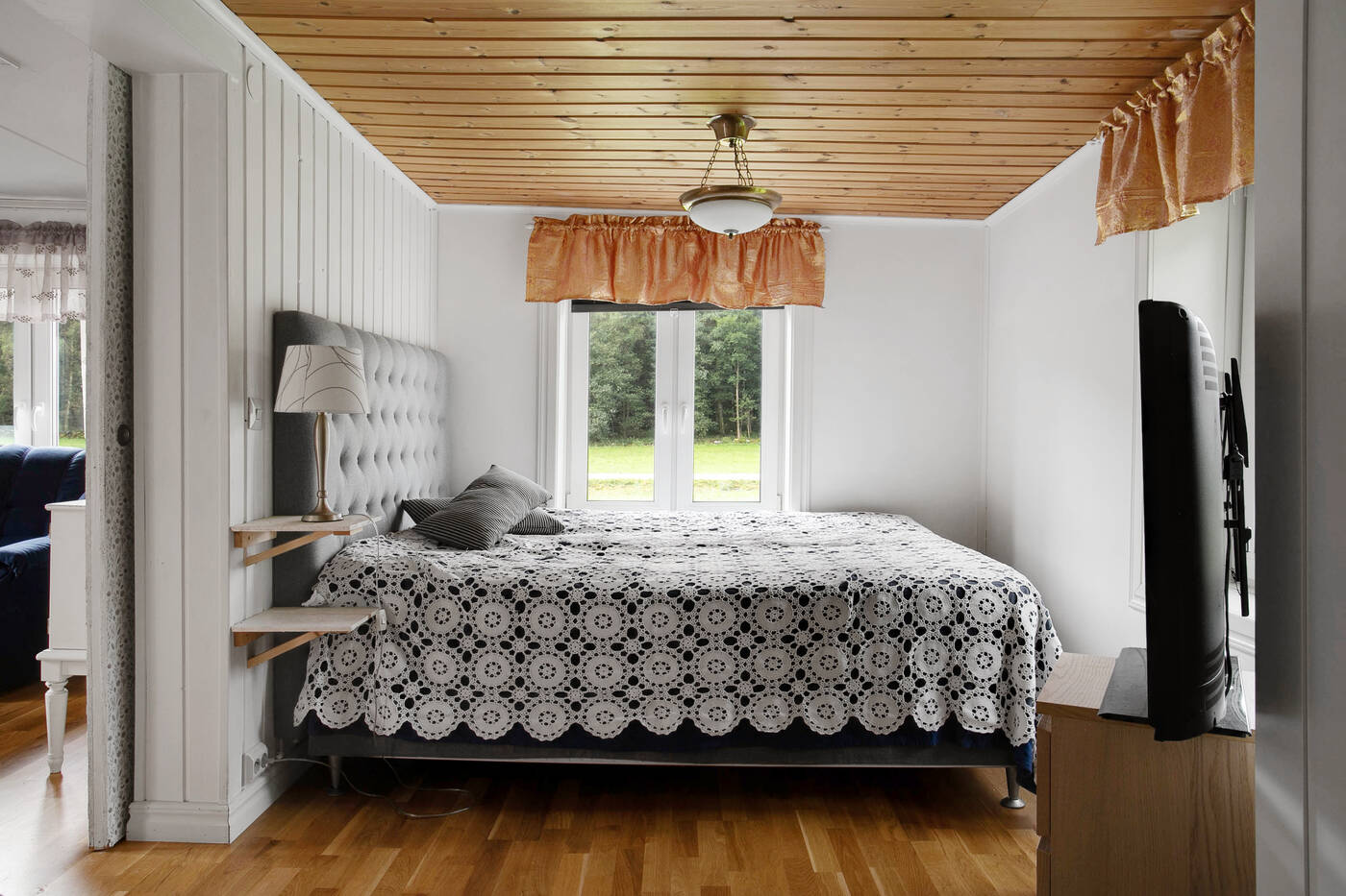 Välkommen in i entréhallen via en stor solig altan. Från hallen kommer du in i en storstuga med vedspis och ekparkettgolv. Innanför storstugan finns första sovrummet också med parkettgolv. Från hallen når du köket med vedspis förutom normala vitvaror, också med parkettgolv. Till höger finns en helkaklad tvättstuga med tvättpelare och ett helkaklat badrum med WC, tvättsäll och duschhörna. Boyta c:a 60 kvm. En brant trappa leder till en loftliknande övervåning med hall, förråd och sovrum. Boyta c:a 40 kvm. Vidbyggd ved-/ redskapsbod. Härlig tomt om 1001 kvm Boyta 60 kvm med fruktträd och gräsmatta för barn med spring i benen.
